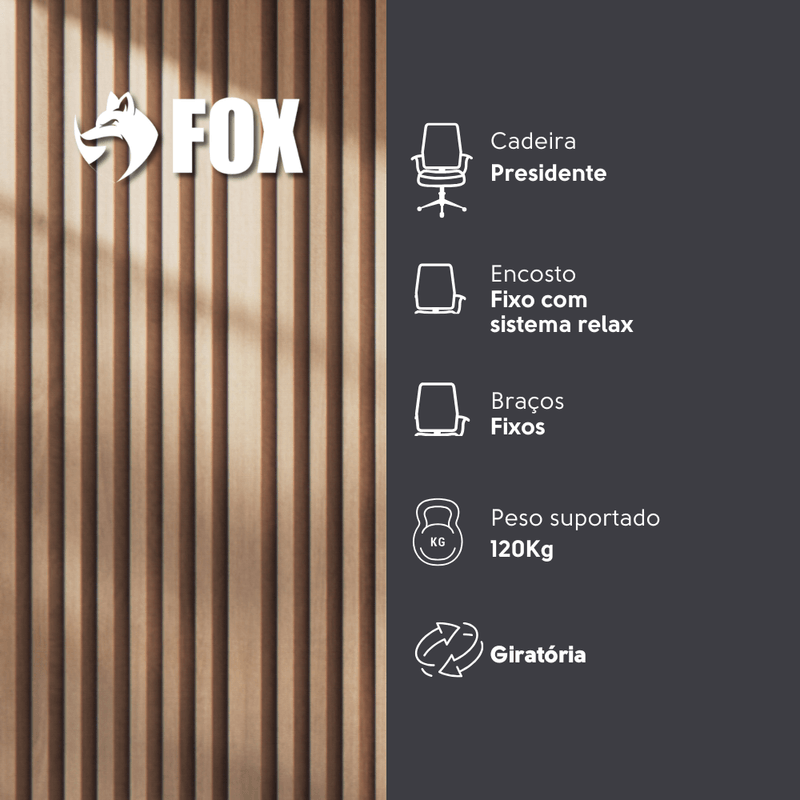 Com recursos como: ajuste de altura, sistema relax e/ou encosto largo e confortável, a cadeira Fox proporciona excelente conforto para qualquer biotipo corporal.