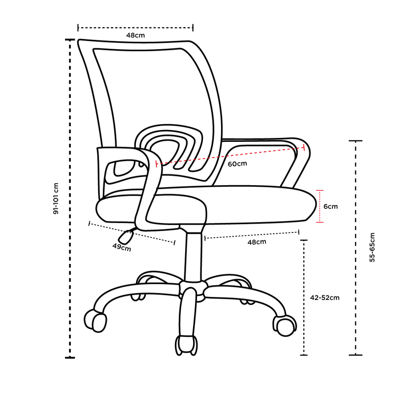 Altura do chão ao braço (mínimo – máximo): 55-65cm