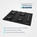 POTÊNCIA TOTAL DE 8.400W: 1 queimador ultrarrápido (2650W) 1 queimador rápido (2350W) 2 queimadores semirrápidos (2x 1700W)