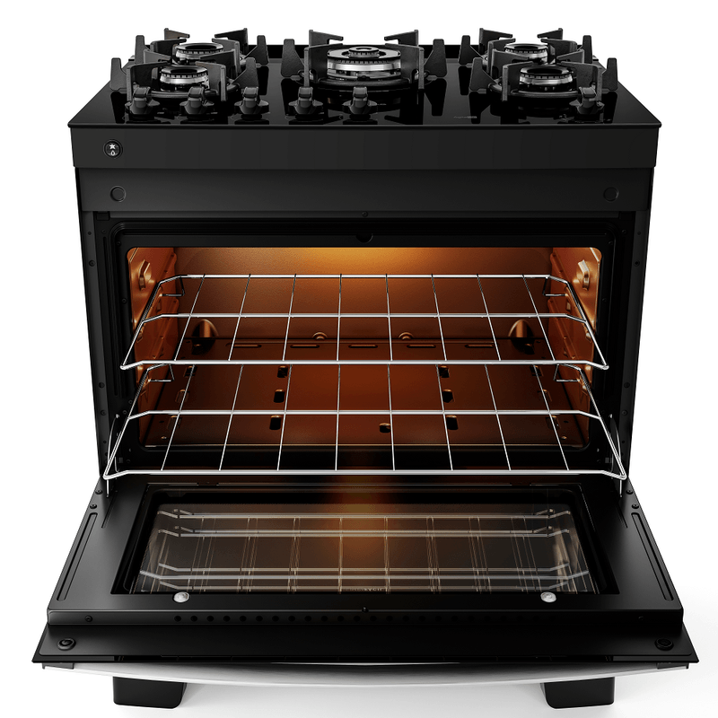 A mesa de vidro ultra resistente e o puxador em alumínio escovado, dão um toque de elegância à sua cozinha. Os pés altos e robustos proporcionam estabilidade e segurança durante o uso e facilitam a limpeza. E o visor amplo do forno oferece uma visão clara dos seus pratos em preparo. As grades de ferro fundido são um destaque no Agile Up, combinando estilo e resistência. Além de proporcionarem um visual único, essas grades foram projetadas para suportar panelas de diferentes tamanhos, garantindo estabilidade. A potência é uma característica essencial em qualquer fogão. O Agile Up vai além ao oferecer queimadores forjados, que garantem um desempenho superior e uma distribuição de calor uniforme. Além disso, a versão com 5 queimadores ainda conta com Tripla Chama para você preparar qualquer receita ainda mais rápido. Para maior praticidade, o fogão de inox possui 2 prateleiras deslizantes, permitindo que você ajuste facilmente a posição dos alimentos dentro do forno. Com a lâmpada do forno, você poderá visualizar seus pratos com clareza e verificar seu cozimento sem precisar abrir a porta do forno, economizando energia e mantendo a temperatura interna estável. O Fogão Agile Up é perfeito para famílias que querem uma cozinha renovada e bonita para receber pessoas queridas. Um produto prático, moderno e durável, que combina com seu dia a dia e estilo. Tudo isso, com o selo de mais de 70 anos de qualidade Atlas. A versão 5 bocas conta com 2 queimadores semirrápido de 1,67kW, 2 queimadores rápido de 2,0kW, 1 queimador Tripla Chama de 3,3kW e forno com capacidade de 86,5 litros.