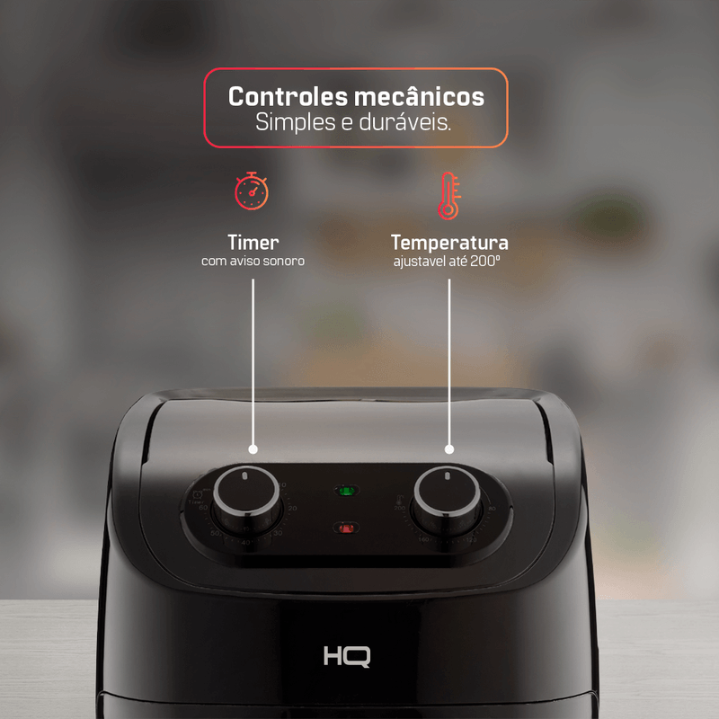 Controle analógico simples e direto: dois botões giratórios para programar tempo (1 a 60 min) e temperatura (80°C a 200°C).