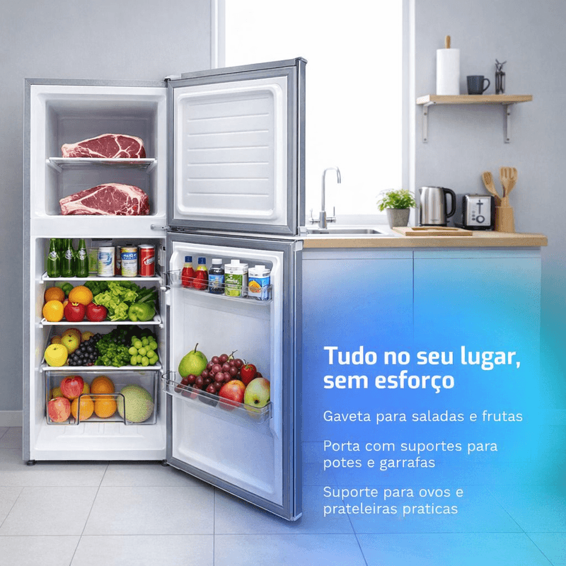 Refrigerador com 95L de capacidade, prateleiras bem distribuídas, gaveta inferior para frutas e verduras, suporte para ovos e compartimentos na porta para garrafas, potes e frascos.