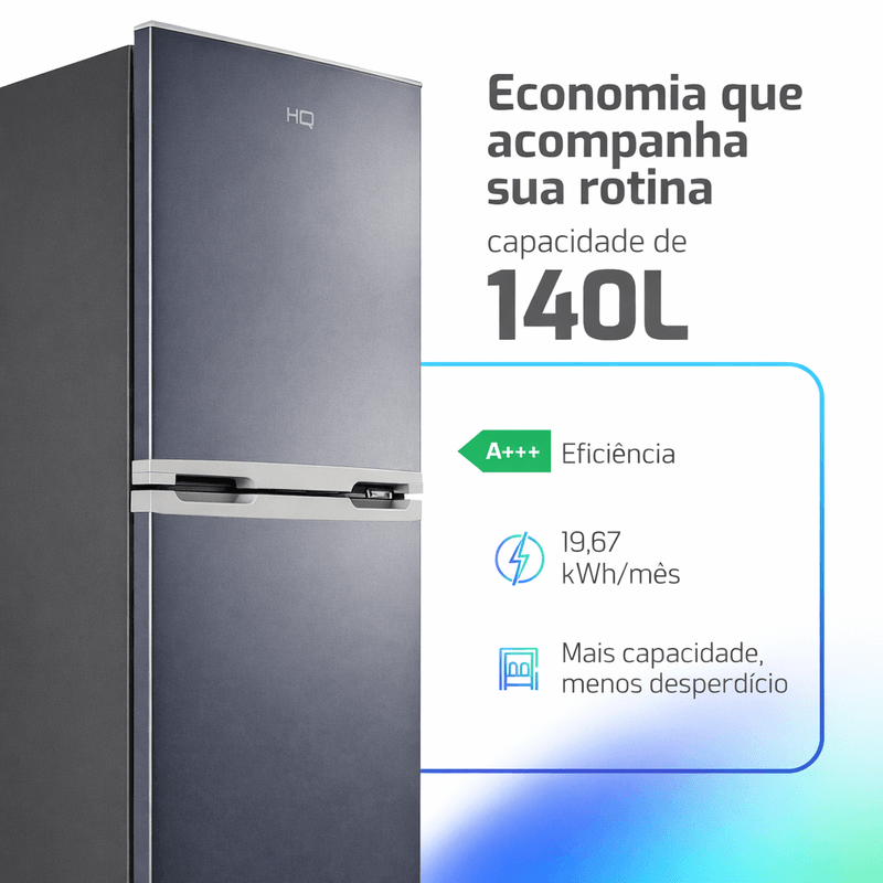 O HQ-140RDF entrega a praticidade de um refrigerador duplex com freezer dedicado em dimensões reduzidas, ideal para ambientes com limitação de espaço sem abrir mão de funcionalidade.