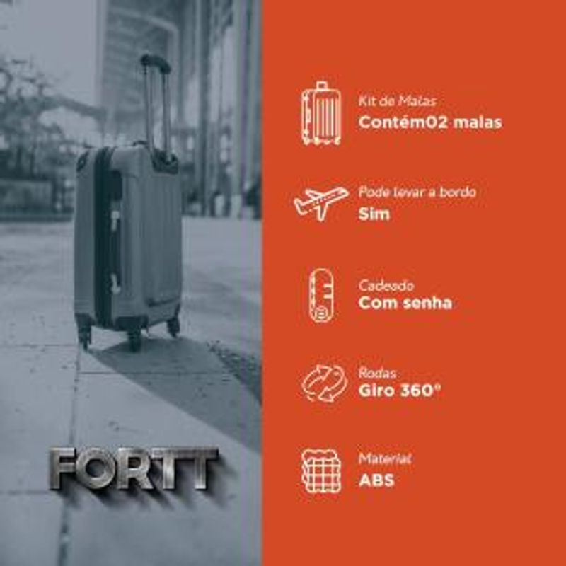 A Mala de Bordo Adventure Fortt, foi desenvolvida com o que há de mais moderno. Ela é produzida em ABS, que é um material resistente e de fácil limpeza. Possui 4 rodas com giro de 360°, é equipada com cadeado fixo, com senha configurável para a proteção de seus itens e internamente, possui cintas elásticas para lhe ajudar na organização de seus pertences.