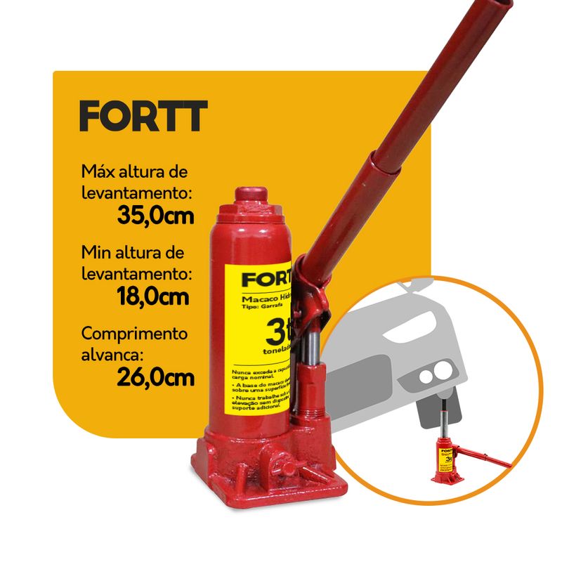 Os macacos hidráulicos tipo jacaré FORTT possuem uma válvula de segurança para a elevação de cargas. Esta ferramenta é indispensável em estações de serviço e frequentemente utilizada na construção civil. Sua altura máxima de elevação permite a instalação de suportes rígidos sob a carga elevada, e a válvula de segurança impede o aumento da carga com uma massa maior do que a indicada pelo fabricante.
