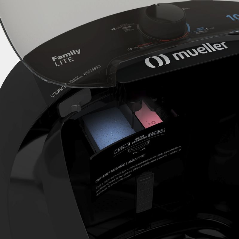 O Tanquinho Family Lite 10kg da Mueller também conta com dispenser para sabão em pó e amaciante que permite que ambos sejam despejados no momento certo da lavagem.