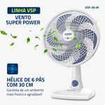 VENTO SUPER POWER: A linha de Ventiladores Super Power possui 30cm de diâmetro e 6 Pás. O design, aliado à potência, promove maior intensidade do vento e é garantia de um ambiente fresco e agradável.